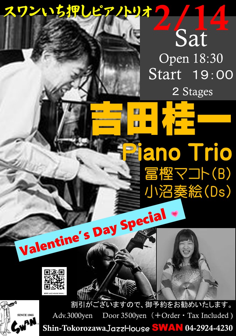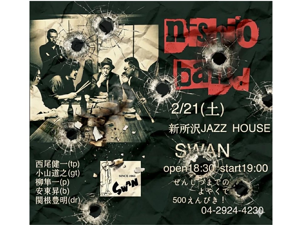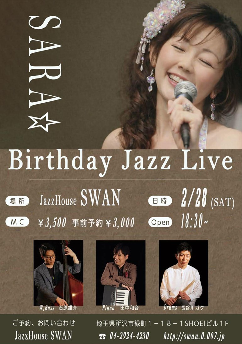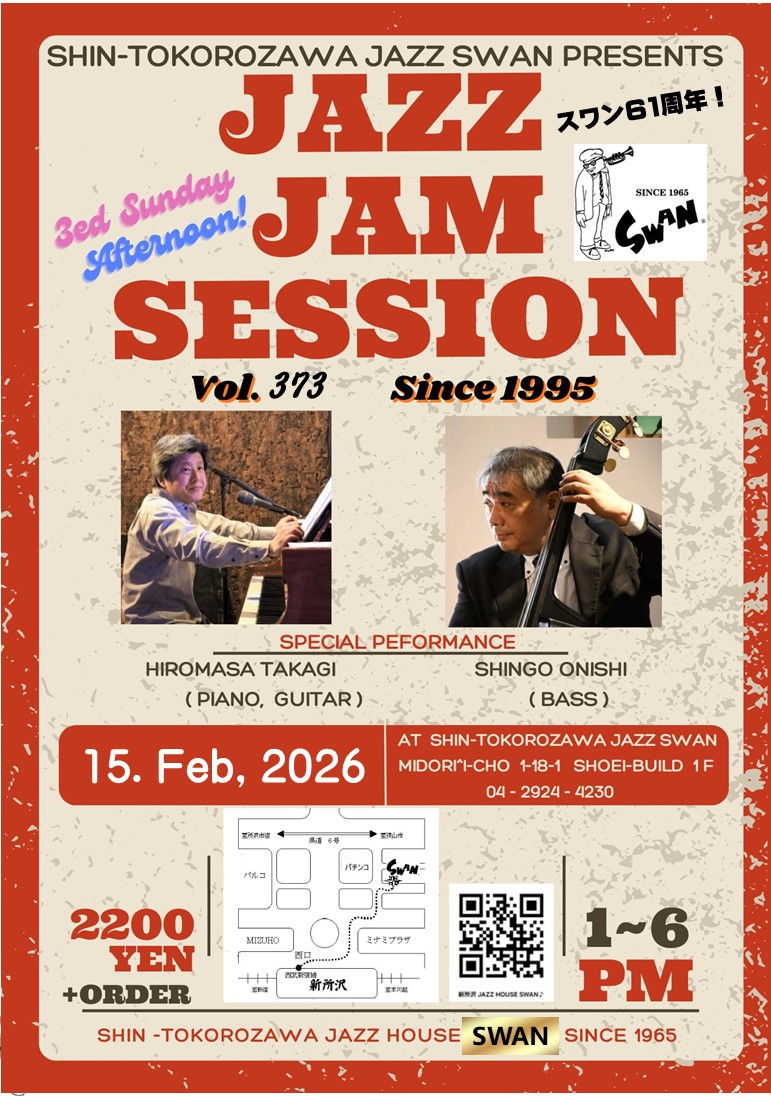営業時間:15:00~26:00 金曜日は、ライブがありませんので、 ゆっくり呑みに来ていただけます。 どうぞ、お寄りくださいませ。 ライブに関しては、 18:30 オープン 19:00 スタート 2ステージ 時間変更・延期などありますので 随時ご確認くださいますよう、 よろしくお願いいたします。 なお、割引がございますので、 前日までのご予約(チャージ500円オフ)を お勧めしております。 ご予約 スワン:04-2924-4230 メール・・・swan.1965-2daime_mastacos@ezweb.ne.jp Facebookでも受け付けます。 埼玉県所沢市緑町1-18-1SHOEI ビル1F 新所沢ジャズハウス・スワン 04-2924-4230 |